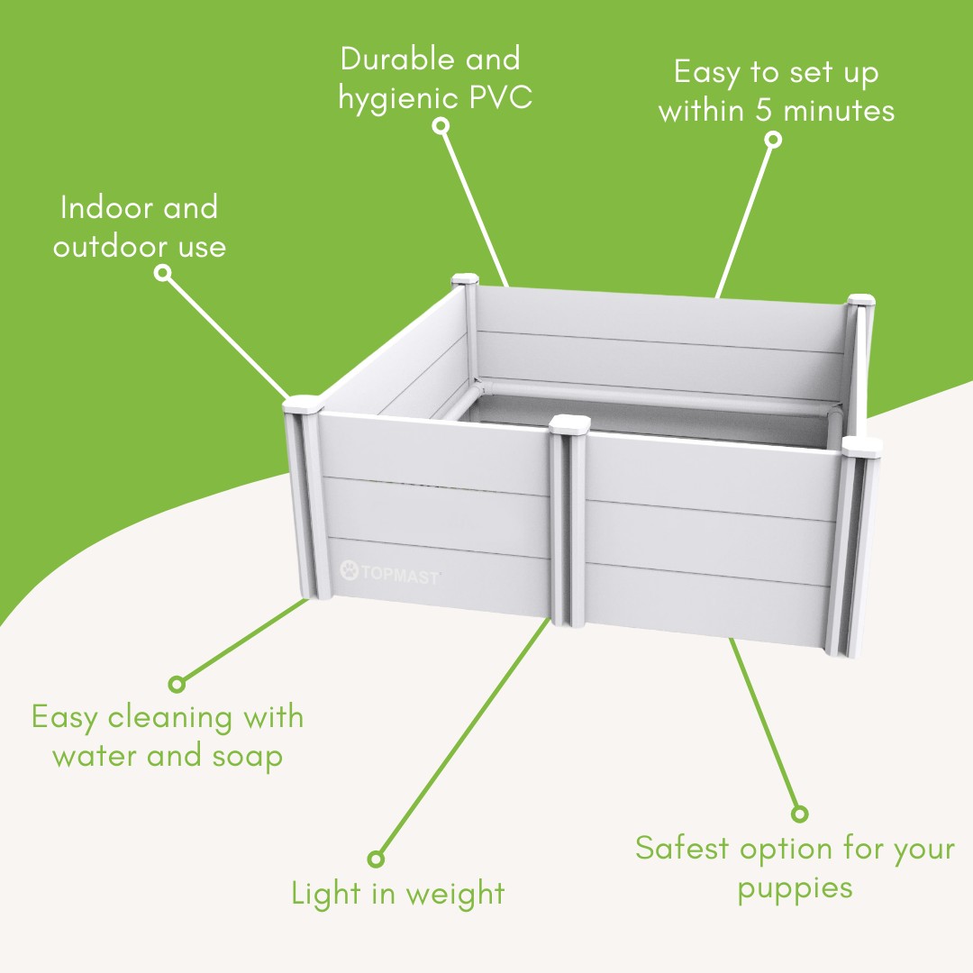 Deze PVC werpkisten van Topmast zijn ontworpen om honden een veilige en comfortabeleomgeving te bieden tijdens de geboorte van de puppy's. Het PVC is gemakkelijk te reinigen, licht van gewicht en eenvoudig op te zetten dankzij de opgenomen instructie. De werpkisten zijn tevens voorzien van een anti-doodligstang rond de zijkant van de bak om te voorkomen dat de moeders op de puppy's rollen. De hoogte van deze anti-doodligstang kan worden aangepast en volledig worden verwijderd zodra de puppy's ouder zijn.